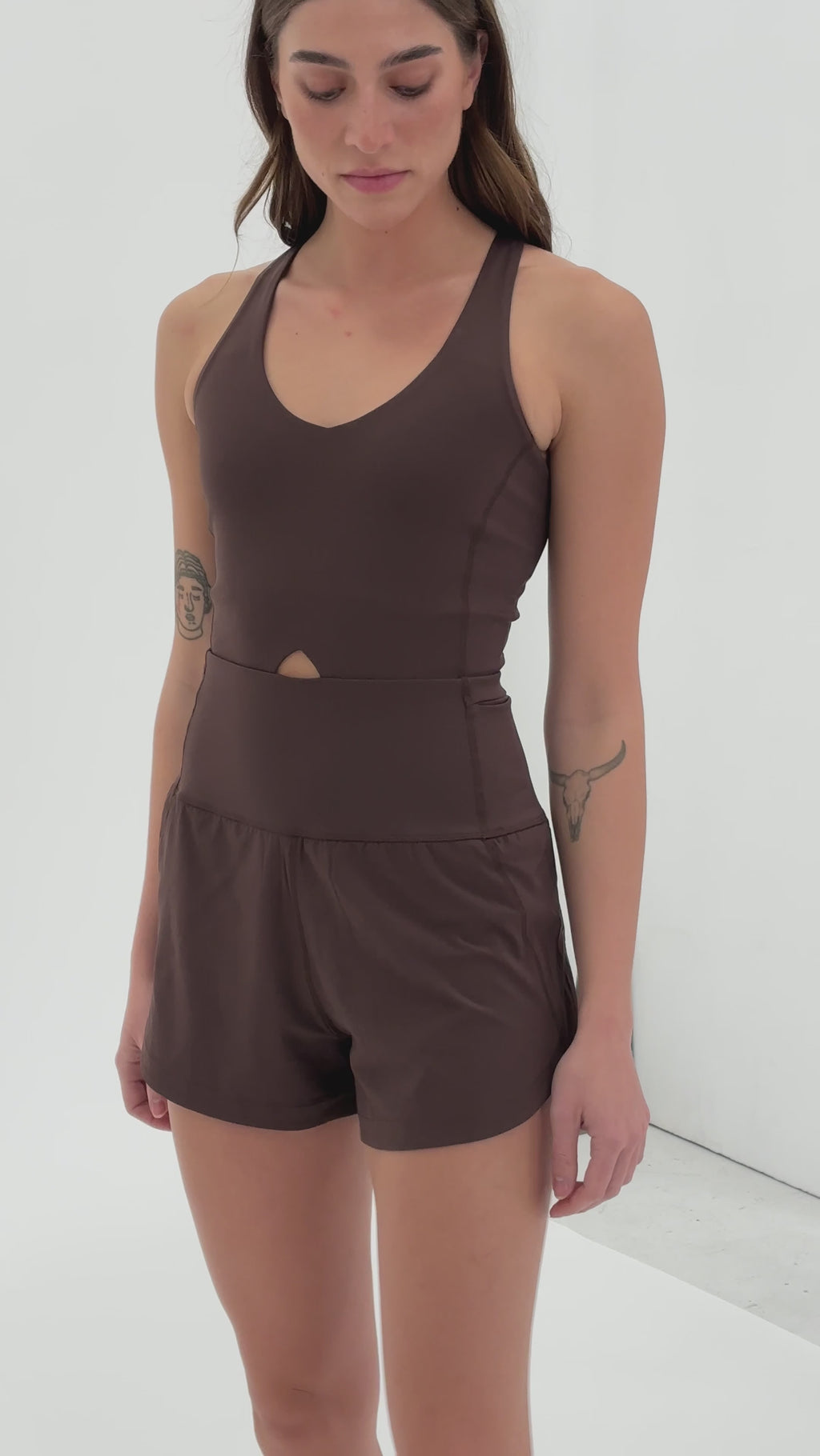 Close-up of khaki green sustainable bodysuit showing scoop neckline, smooth finish and flattering contoured seams Woman wearing khaki green bodysuit with sage shorts and sunglasses, carrying a brown handbag